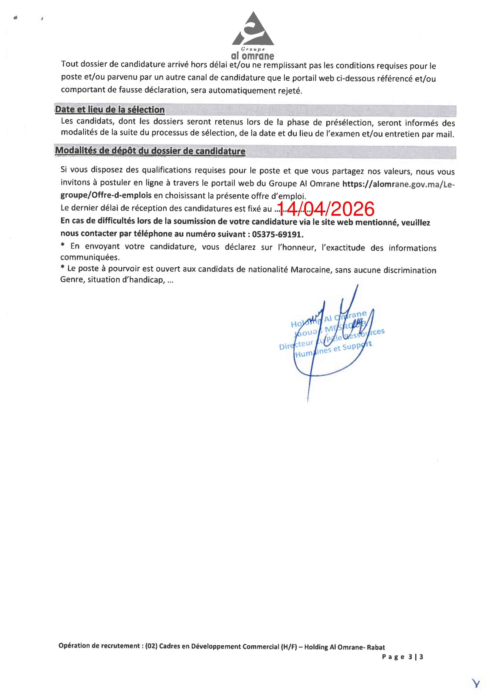 Le Groupe Al Omrane organise un concours pour le recrutement de 2 Cadres en Développement Commercial. La date limite de dépôt des candidatures est fixée au 14 Avril 2026.