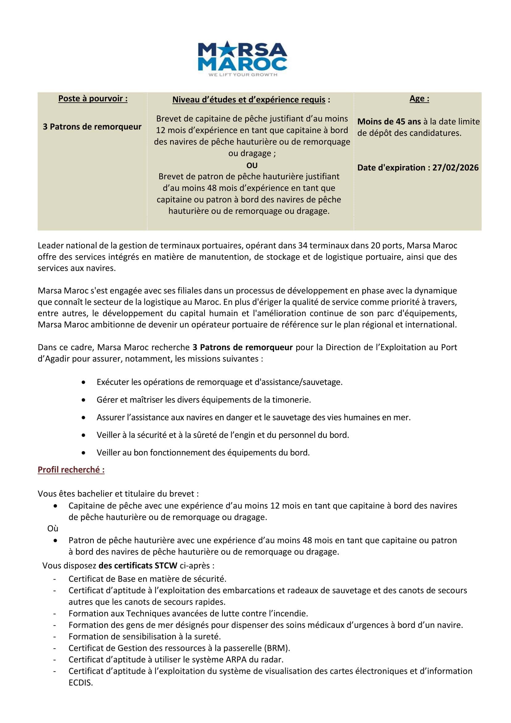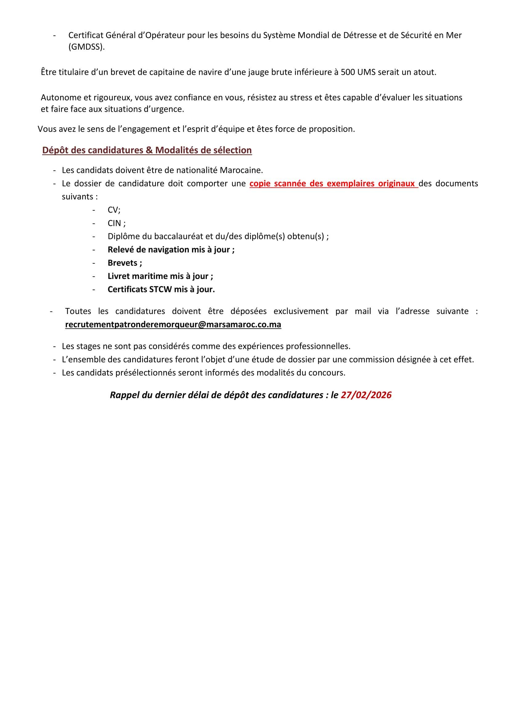 Email de candidature: recrutementpatronderemorqueur@marsamaroc.co.ma