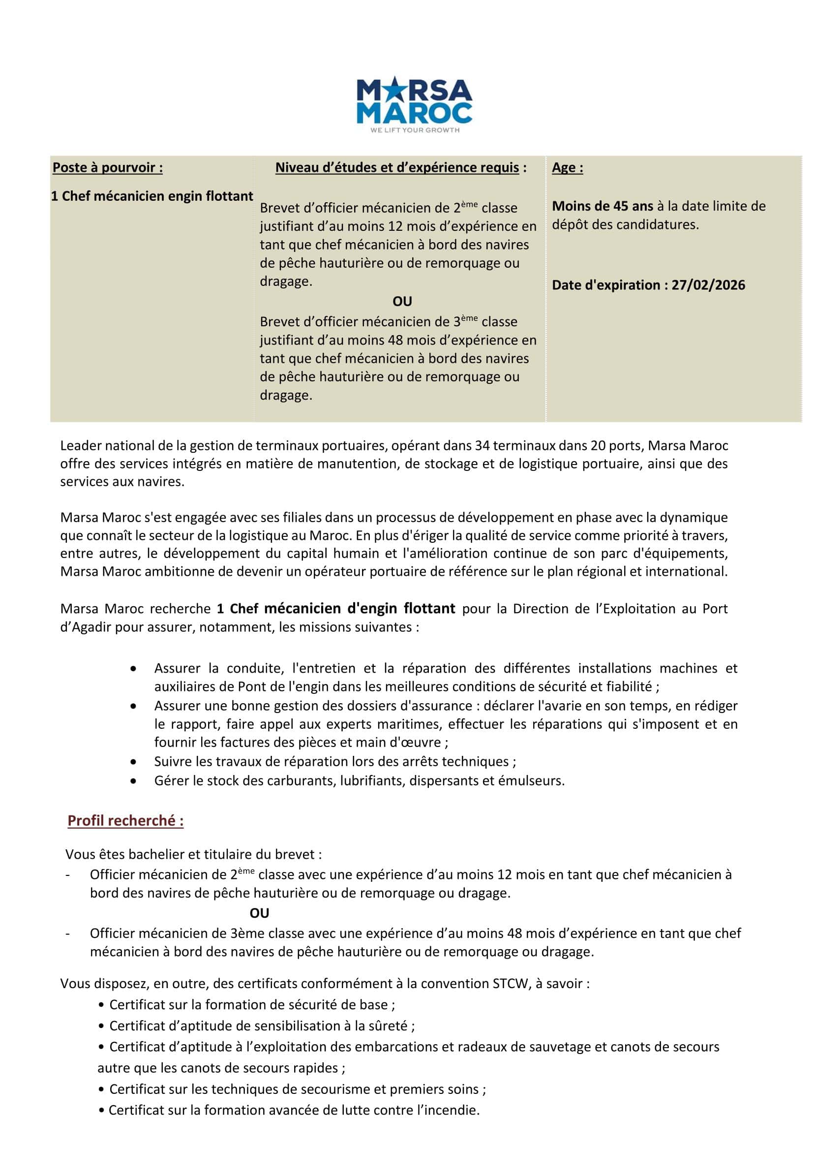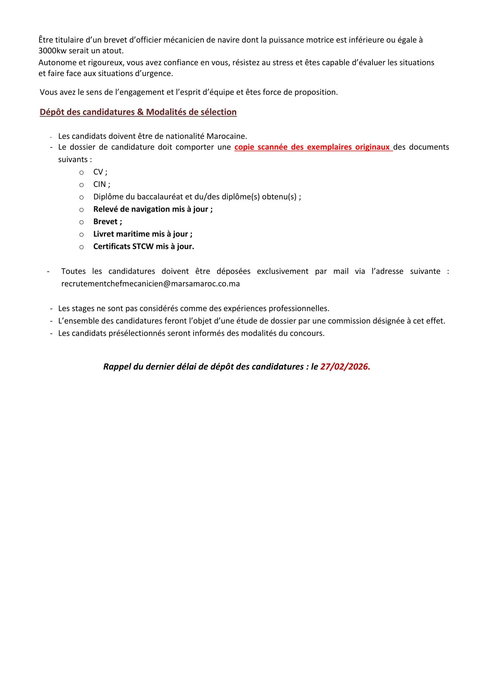 Email de candidature: recrutementchefmecanicien@marsamaroc.co.ma