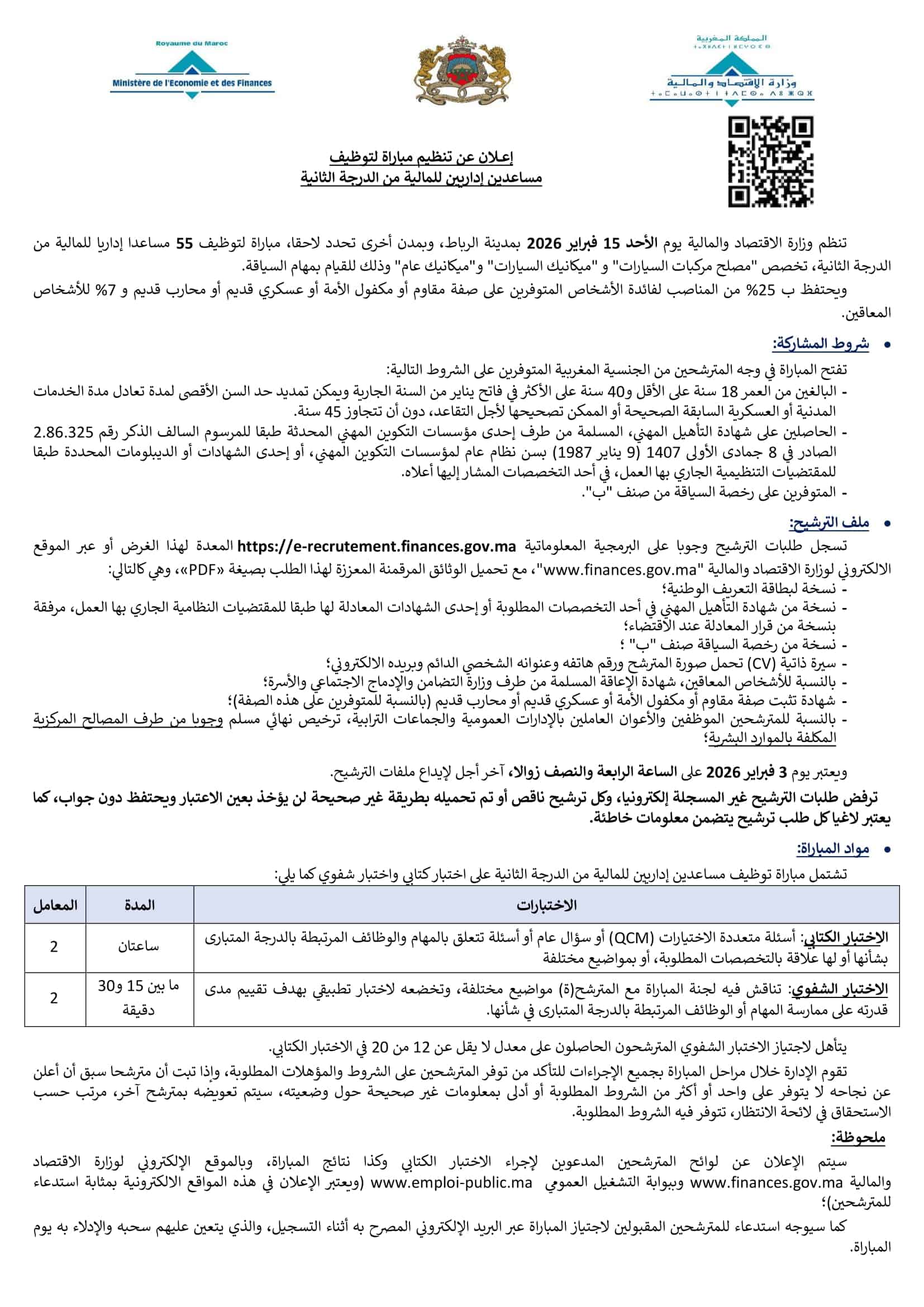 يمكن التقديم عبر الموقع الرسمي لوزارة الاقتصاد والمالية المغربية. آخر موعد للتقديم هو 3 فبراير 2026، والامتحان المحدد في 15 فبراير 2026. زوروا الرابط الرسمي للتقديم.