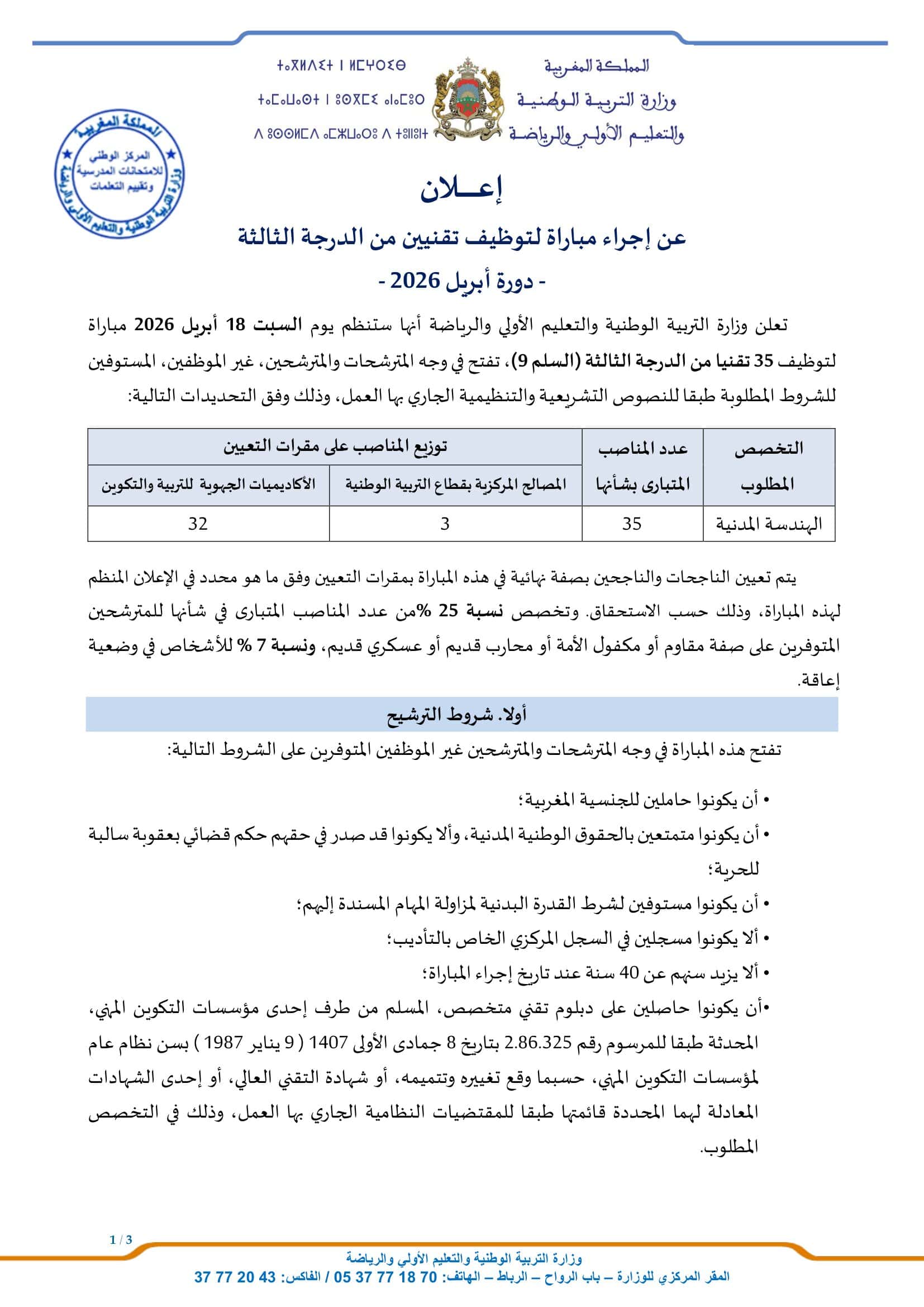 Concours de Recrutement Ministère de l’Education Nationale 2026 (135 Postes)