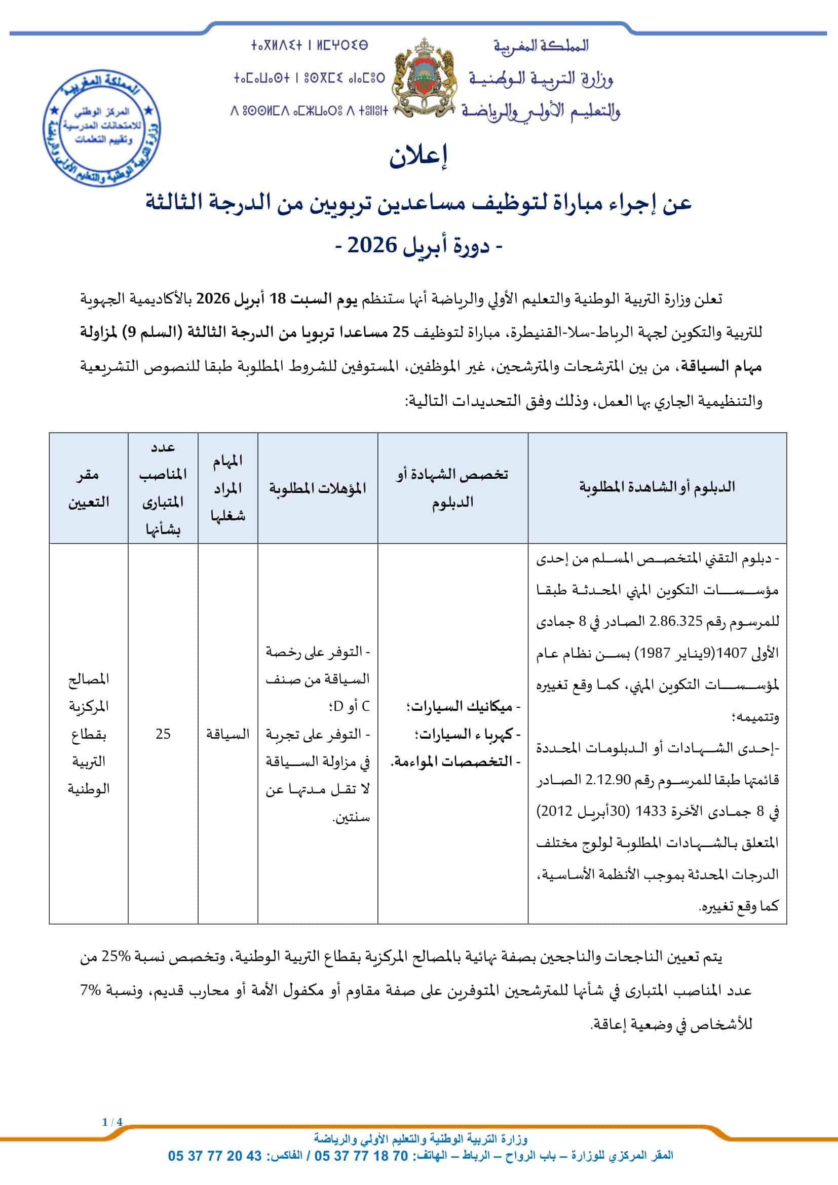 Le concours aura lieu le 18 avril 2026. Le dernier délai pour postuler est le 11 avril 2026.