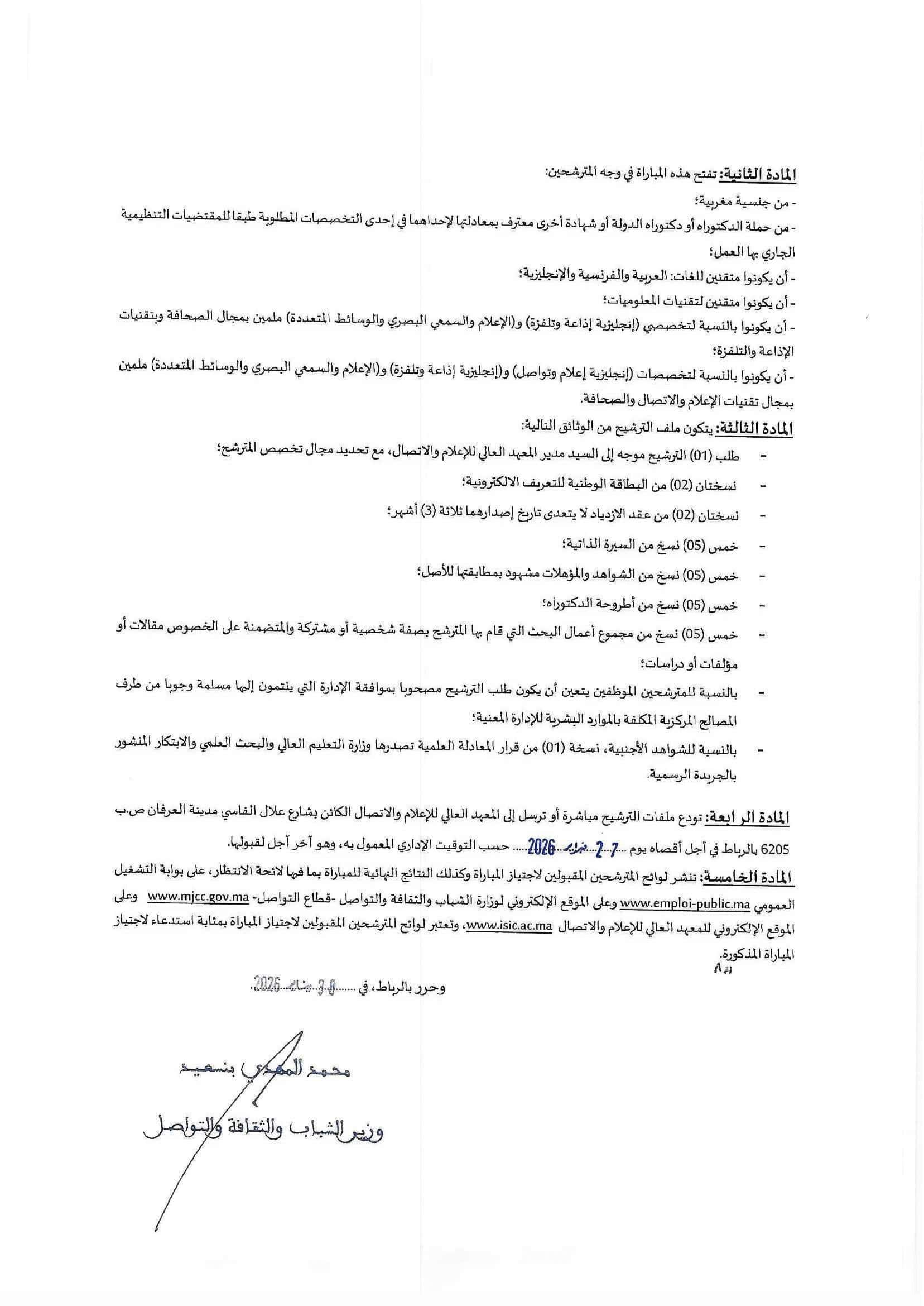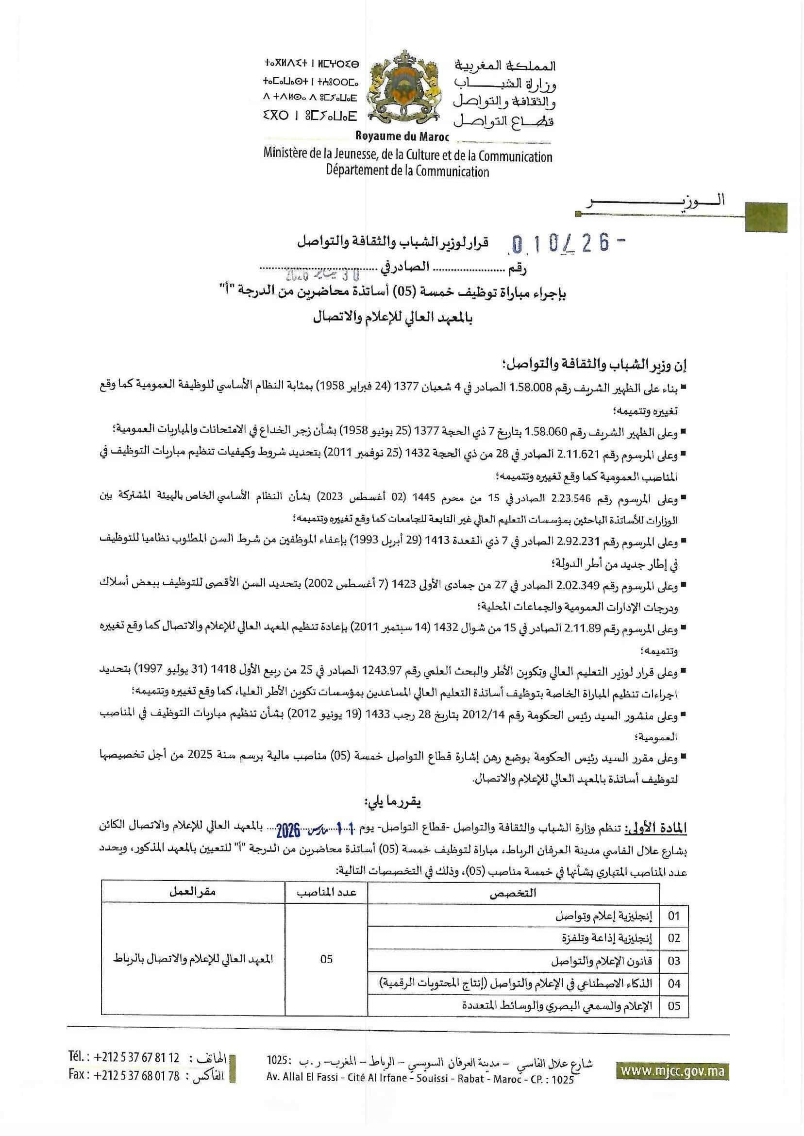 Le Ministère de la Jeunesse, de la Culture et de la Communication, Département de la Communication, organise un concours pour le recrutement de 5 Maîtres de Conférences. La date limite de dépôt des candidatures est fixée au 27 Février 2026, avec un concours prévu le 11 Mars 2026.