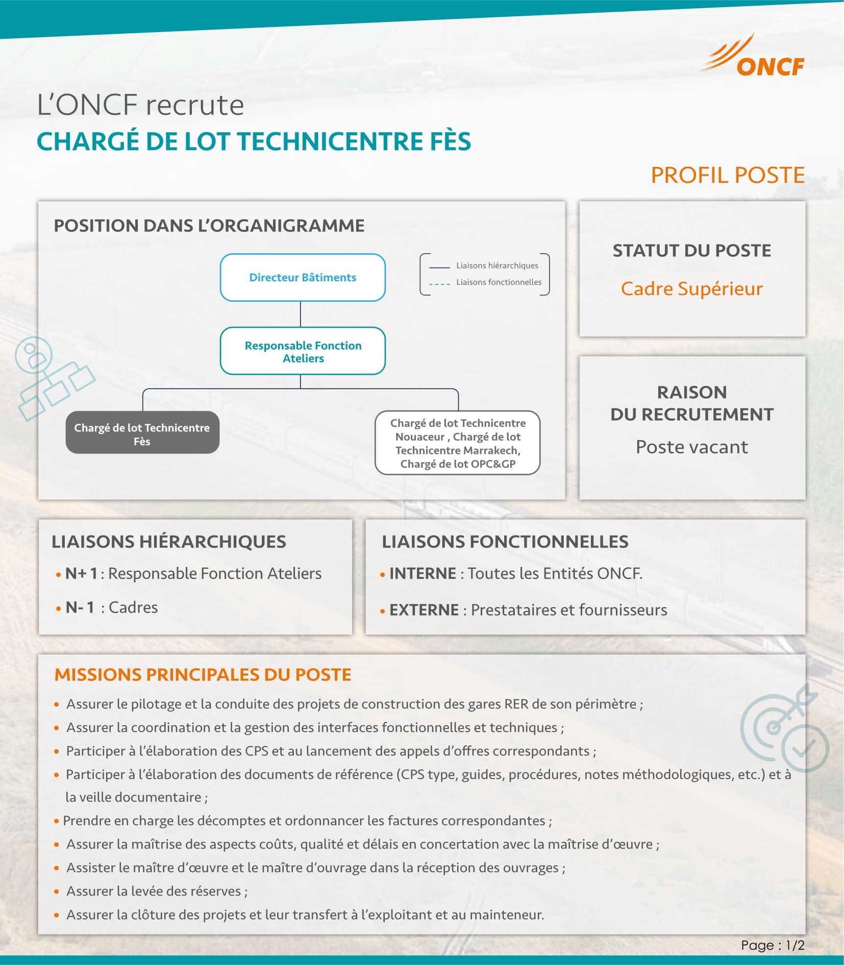L'Office National des Chemins de Fer (ONCF) organise un concours pour le recrutement de 5 postes répartis comme suit :