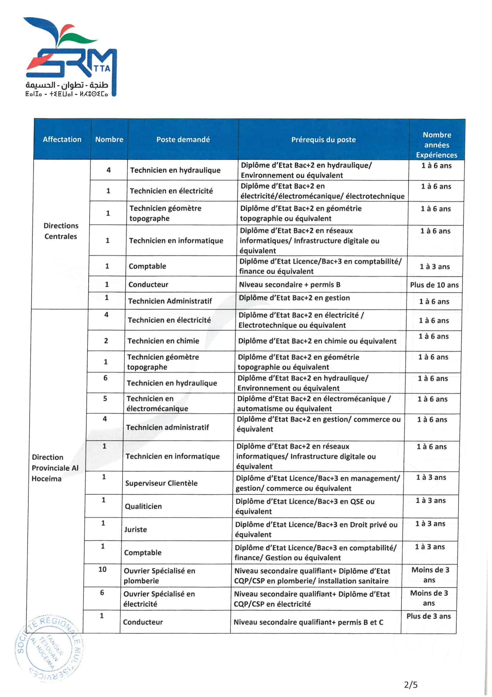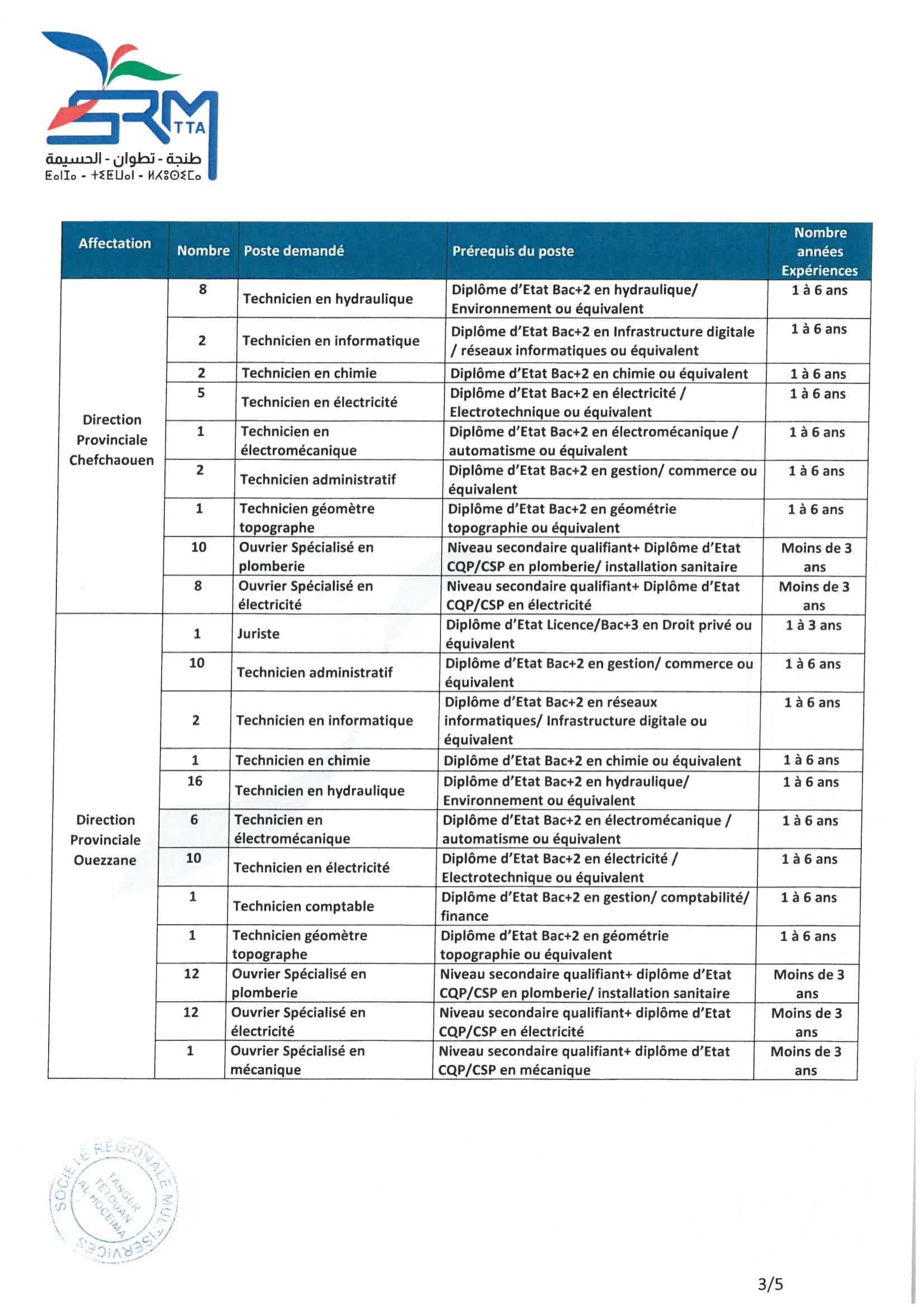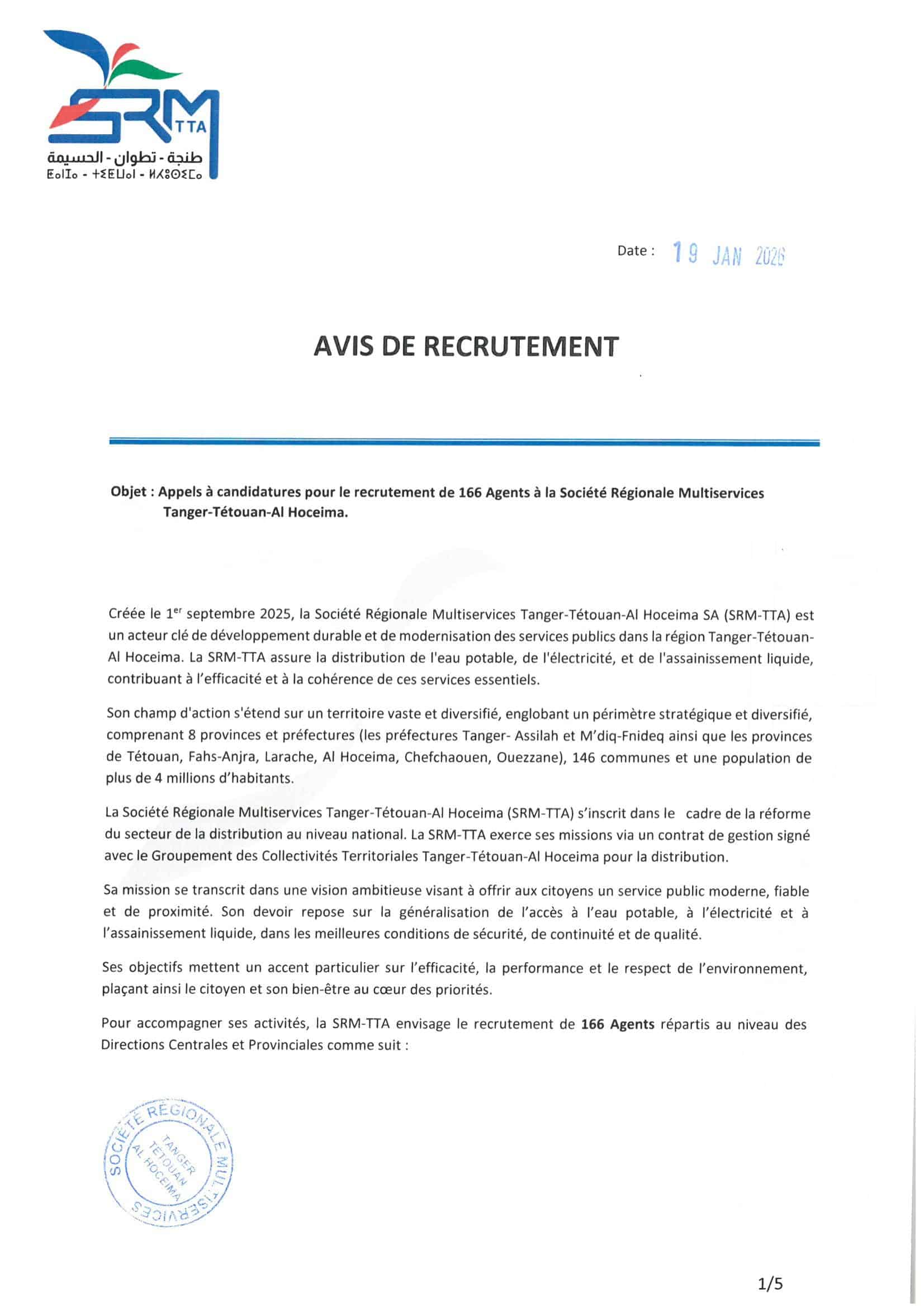 La Société Régionale Multiservices Tanger-Tétouan-Al Hoceima (SRM-TTA) lance un concours pour le recrutement de 166 agents répartis sur des postes techniques, administratifs et opérationnels. Les candidatures doivent être déposées exclusivement en ligne d'ici le 02 février 2026 à 23h00.