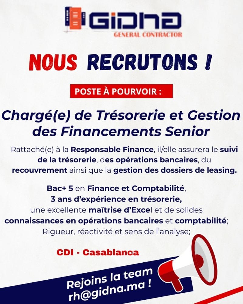 Les candidats intéressés par le poste de Chargé(e) de Trésorerie et Gestion des Financements Senior doivent envoyer leur candidature à rh@gidna.ma.