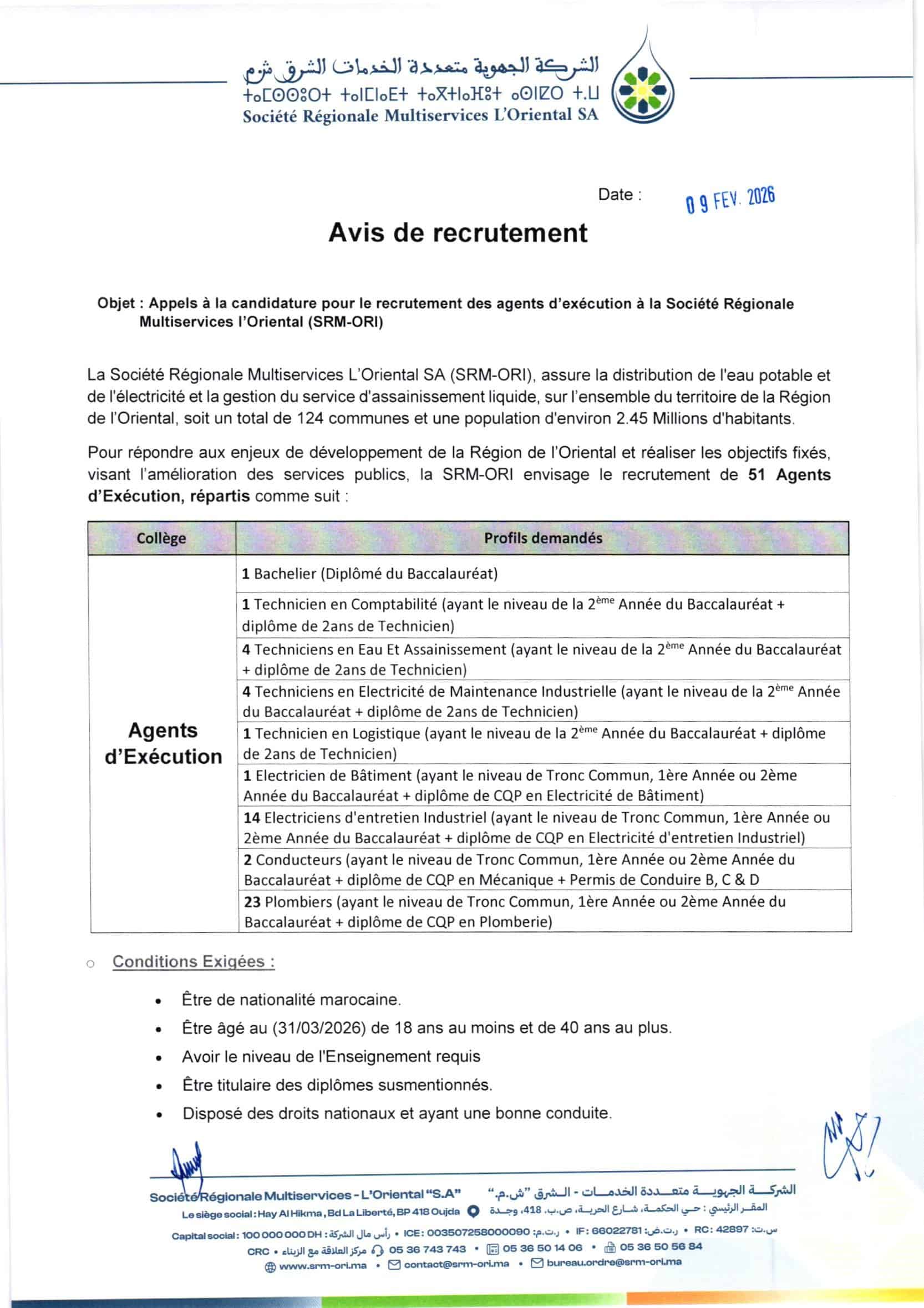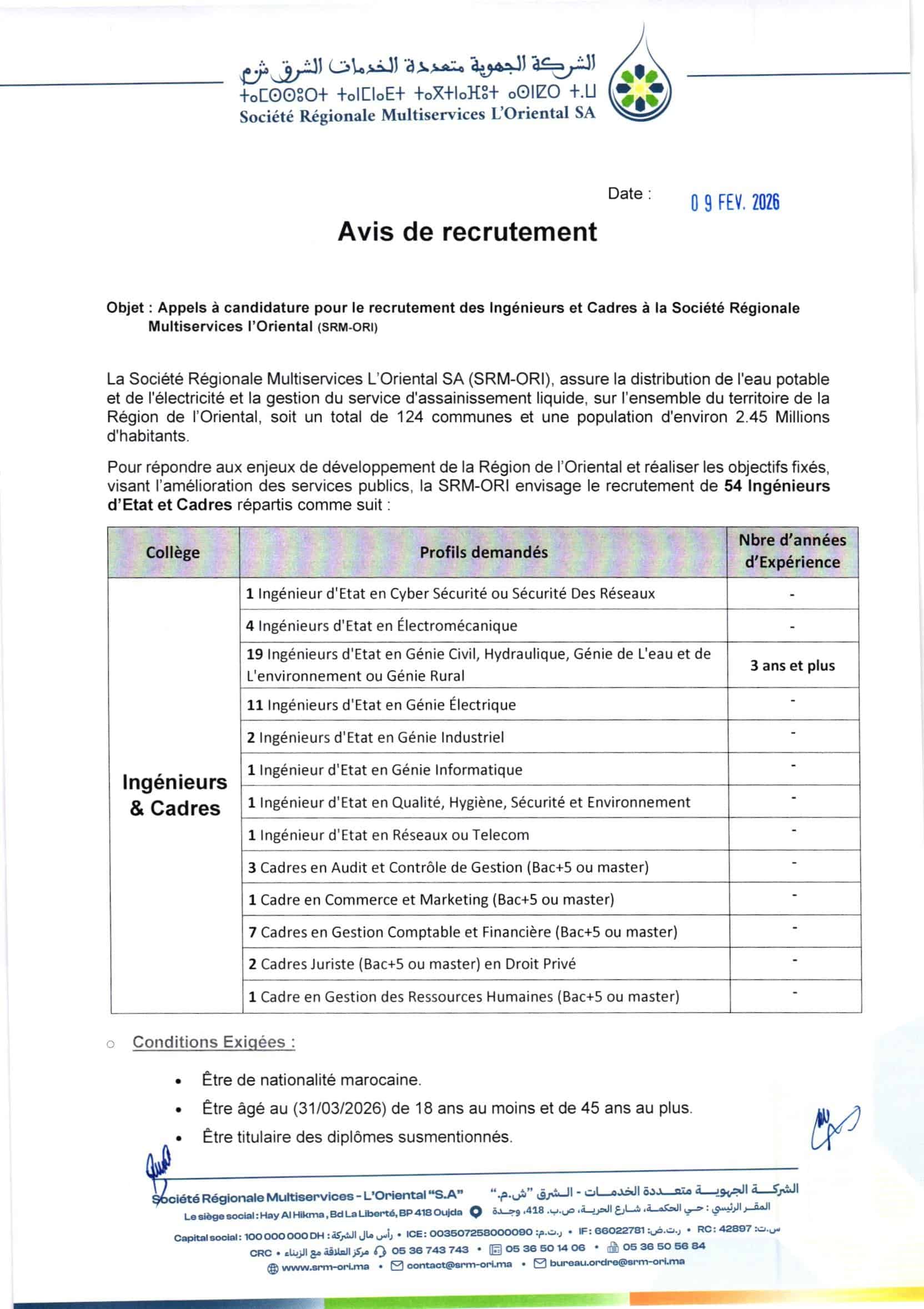 الشروط تُحدد حسب الفئة المرشحة (عامل تنفيذي، عامل إشراف، مهندس/cadre). يجب مراجعة الوثائق الرسمية المُعلنة على المنصة (https://econcours.brainman.ma/cmp/SRM_ORI_2026) للحصول على التفاصيل الدقيقة، بما في ذلك الشهادات والخبرات المطلوبة.