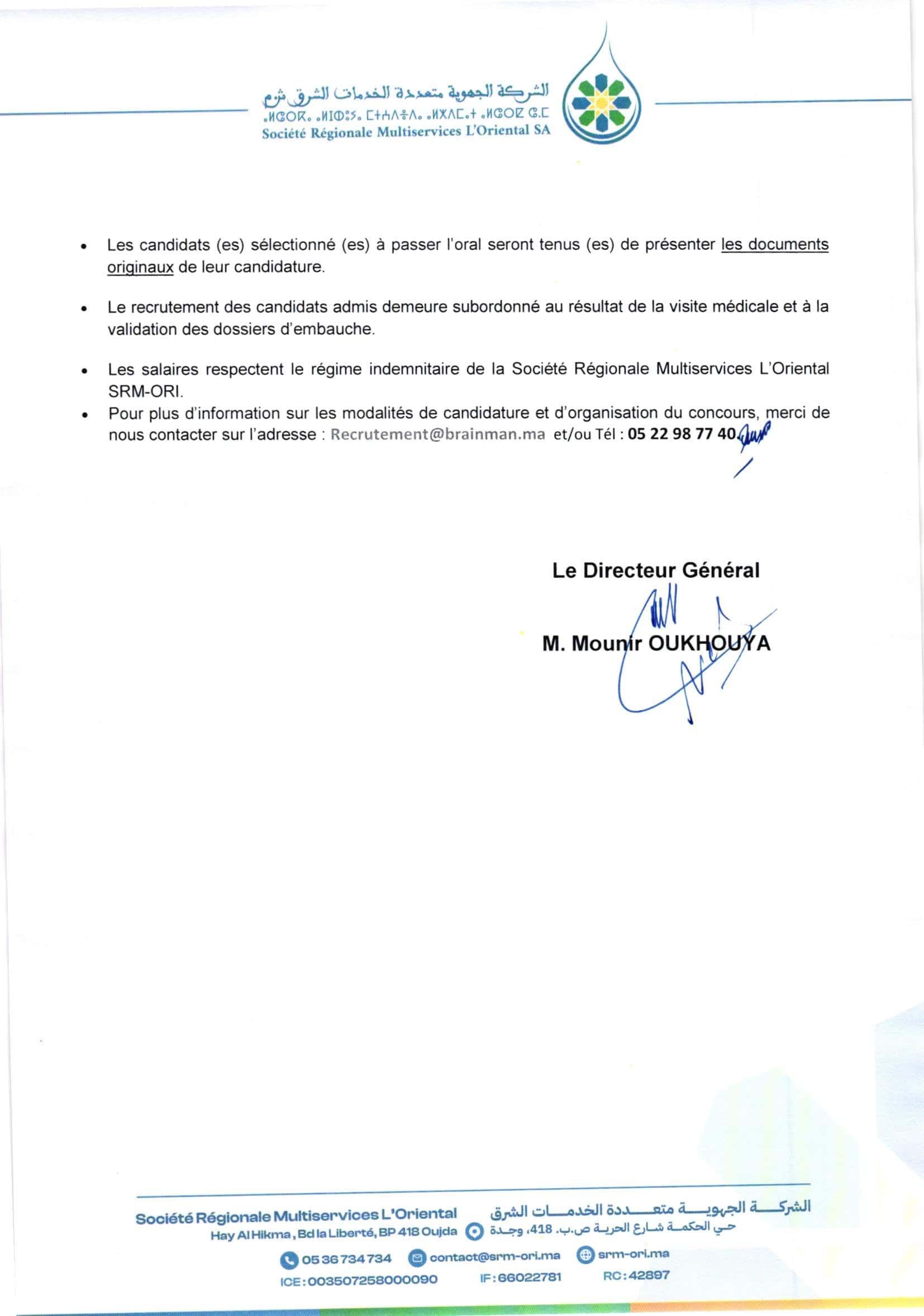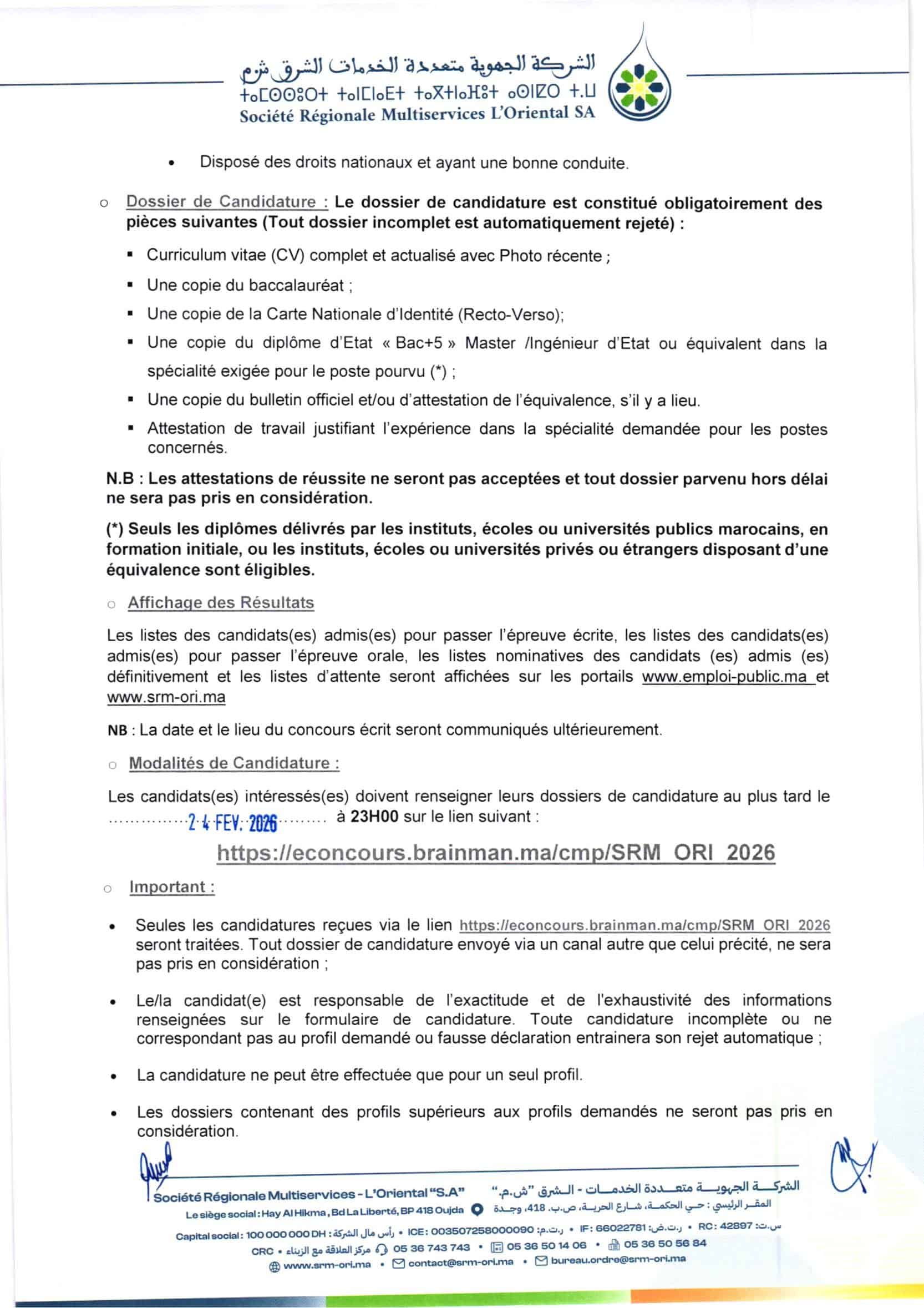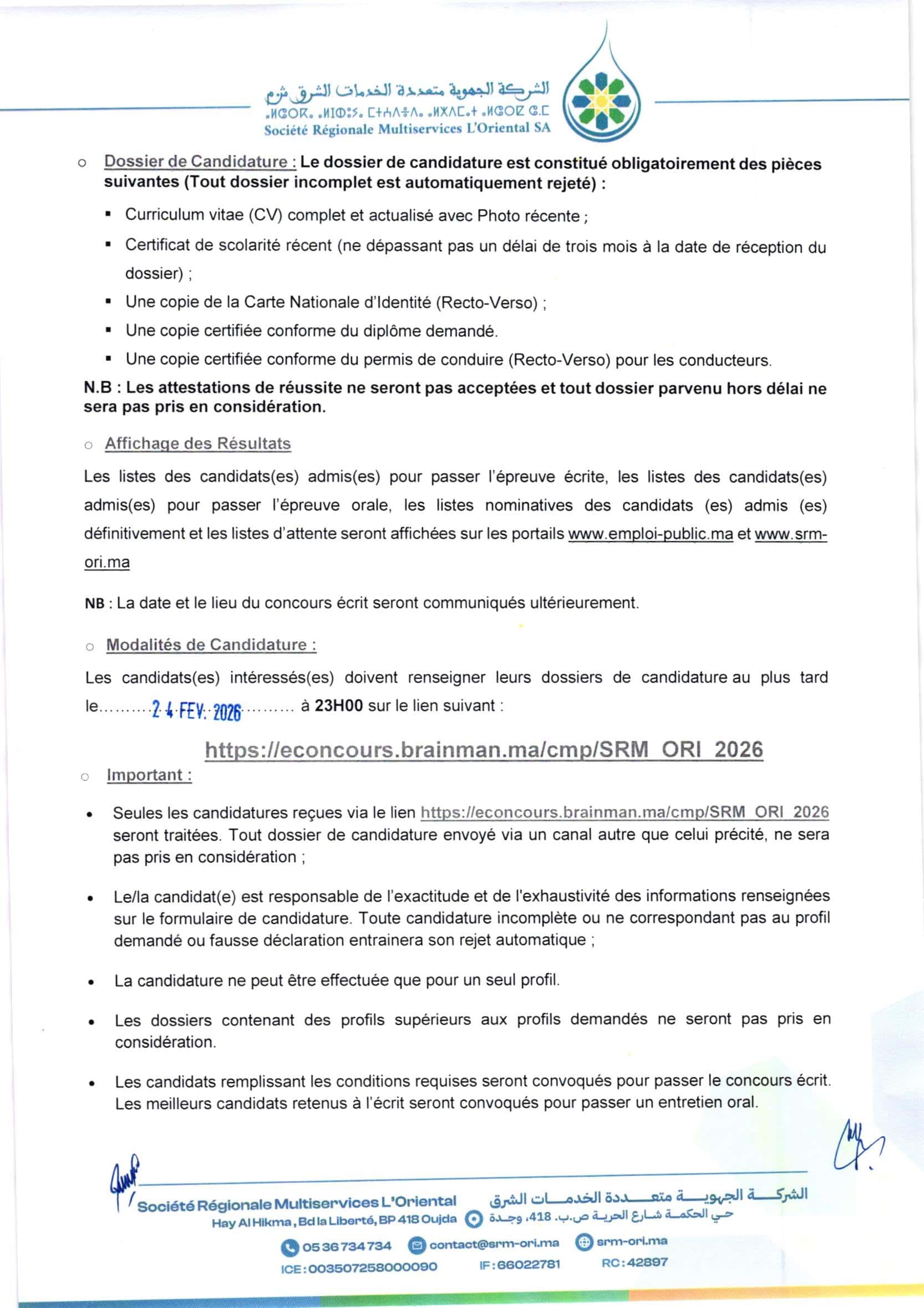Mode de candidature: https://econcours.brainman.ma/cmp/SRM_ORI_2026