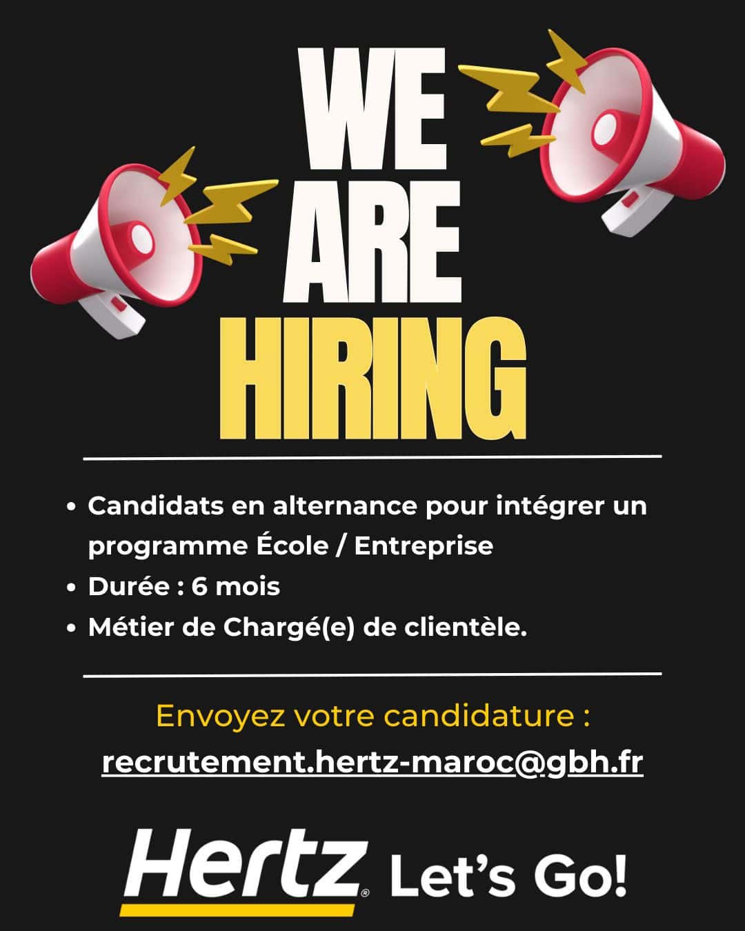Hertz Maroc lance un programme d'alternance de 6 mois pour des Chargé(e)s de clientèle, en partenariat avec SUPEMIR. Cette formation combinant théorie et pratique s'adresse à des jeunes diplômés (Bac+2/Bac+3 en gestion, commerce ou marketing) souhaitant développer leurs compétences commerciales et relation client.
